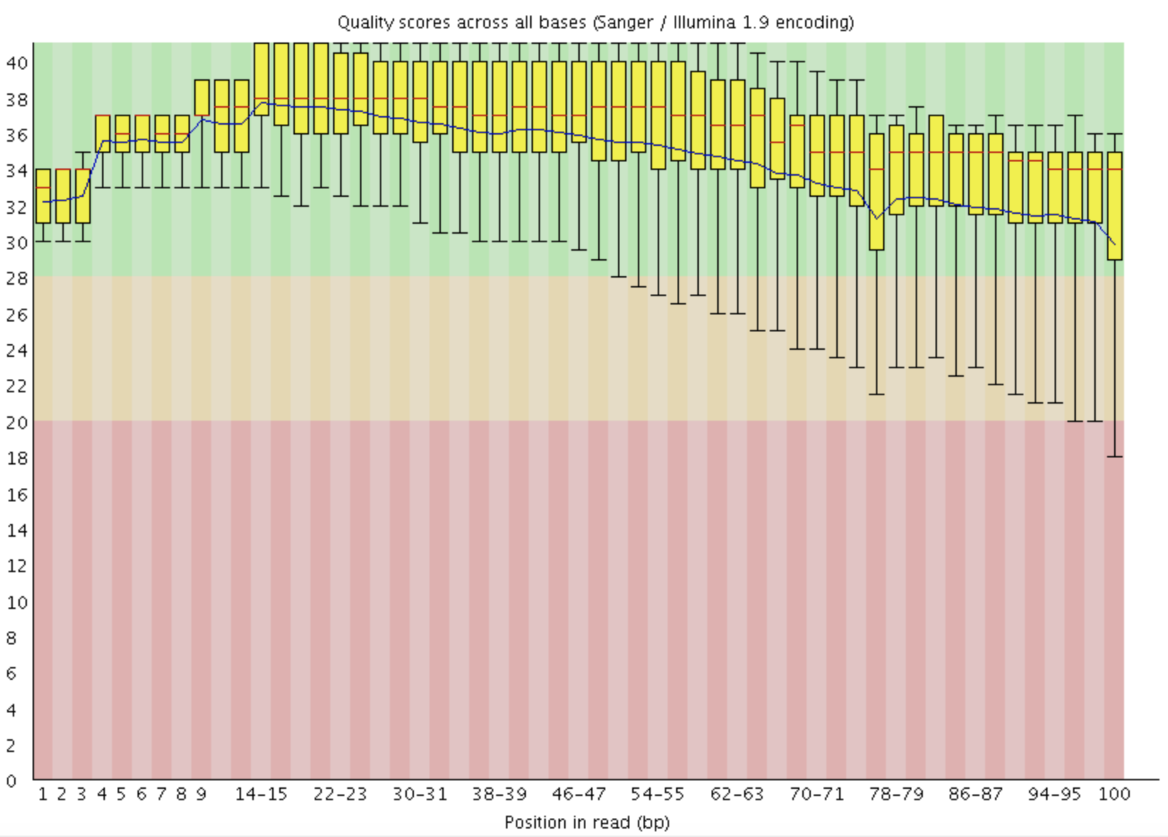Boxplot X: Base pair Y: Q score GOOD: 下四分卫数 > 30 WARN: 下四分卫数 < 10 or Median < 25 FAIL: 下四分卫数 < 5 or Median < 20