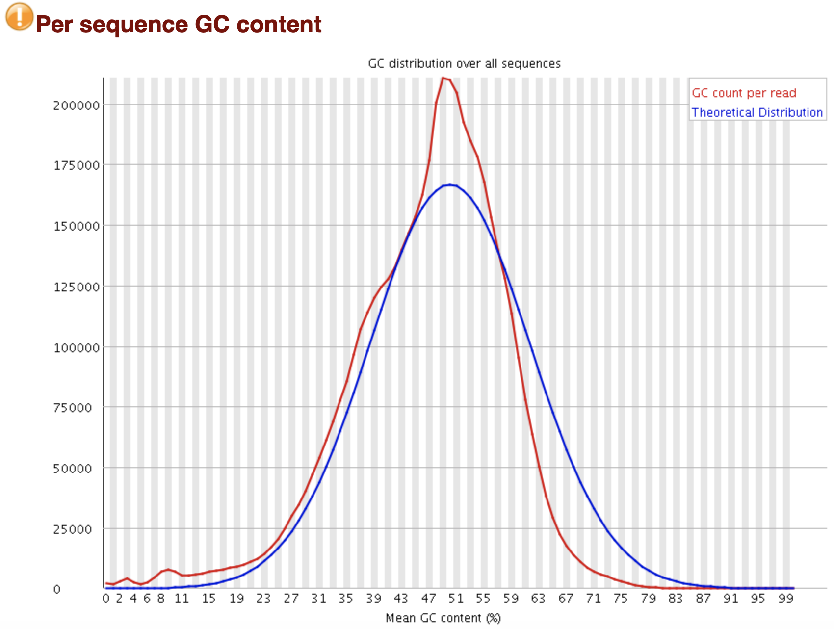 Line Plot X: Mean GC Content (%) Y: Reads count cnote{蓝线}: 理论分布(正态分布) cerror{红线}: 实际分布 形状偏离正态分布: 文库污染、reads代表性有偏... 形状接近正态,但偏离理论分布: 系统误差 WARN: 偏离理论分布的reads > 15% FAIL: 偏离理论分布的reads > 30%