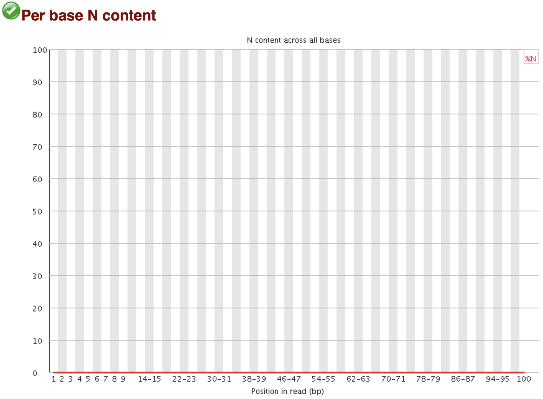 Line Plot X: BP Y: Percentage of N 正常情况下N的比例很小: 紧贴X轴的水平线 "鼓包": 测序系统问题 WARN: 当任意位置的N的比例超过5% FAIL: 当任意位置的N的比例超过20%