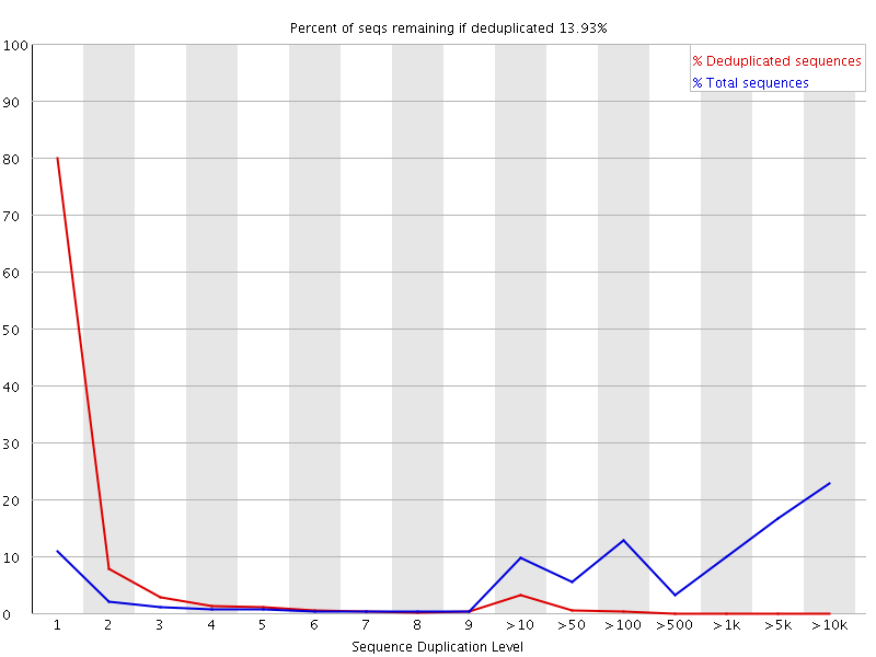 Line Plot X: Sequence Duplication Level Y: Reads percentage 建库过程会产生重复, 测序本身也会产生重复; WARN: 当非unique的reads占总数的比例大于20%时,报"WARN"; FAIL: 当非unique的reads占总数的比例大于50%时,报"FAIL“。