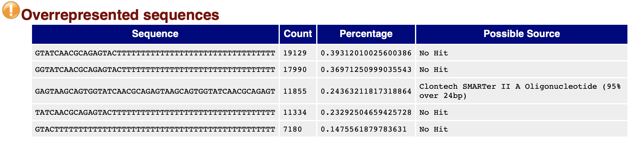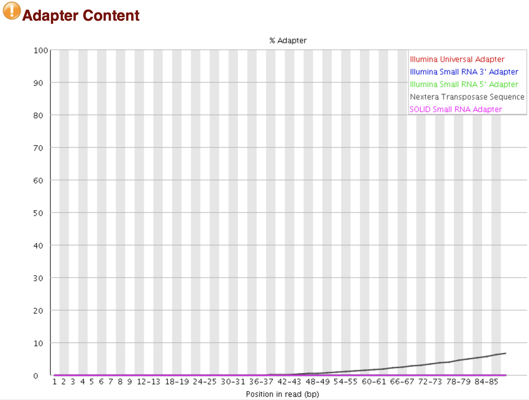Adapter序列在reads中出现的概率 WGS测序中不太会测到接头(片段长) RNA-Seq中有短序列,有可能测到接头 "鼓包": 测序系统问题 WARN: > 5% FAIL: > 10%