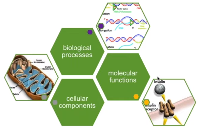 单个的基因产物(包括蛋白质和RNA)或多个基因产物的复合物在分子水平上的活动,比如“催化”,“转运” 需要注意,这里的描述只表示活动,而不指定执行功能的实体(分子或复合物),动作发生的地点,时间或背景 基因产物在执行功能时所处的细胞结构位置,比如在线粒体,核糖体 需要注意:细胞组分是细胞解刨结构,不指代过程 通过多种分子活动完成的生物学过程 需要注意:生物学过程不等同于通路。目前,GO没有表示完整的通路信息所需的动力学或依赖性的描述信息